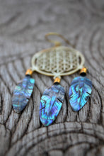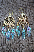 Dreamcatcher earrings made with Abalone shell and nickel free brass, meticulously hand carved feather details and flower of life symbol made with the brass casting technique.